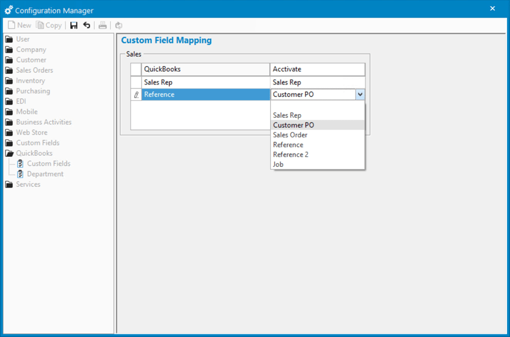 - Map your fields in Acctivate. In Acctivate, open Configuration Manager and expand the QuickBooks section. Under Custom Field Mapping, select which Acctivate fields should sync to which QuickBooks Online custom fields