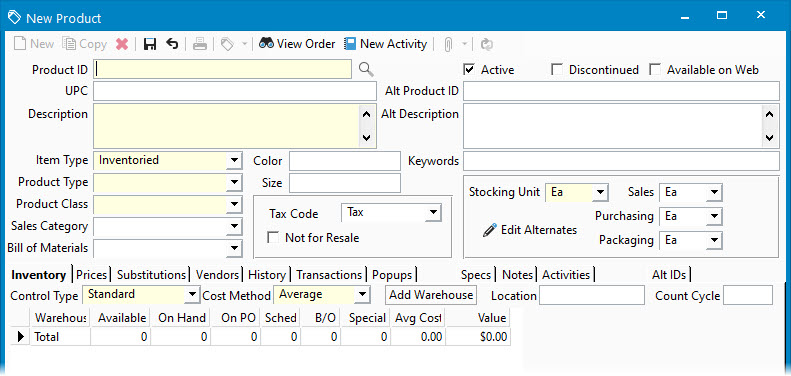 - From the top menu, go to Inventory > Edit Product, then click New or press CTRL+N.