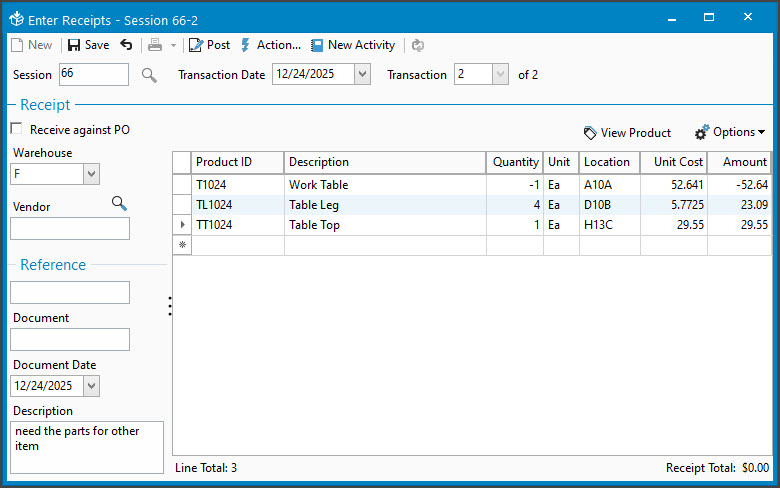 - Enter any optional header information, such as Vendor, Reference, Receiving Document, or Description.