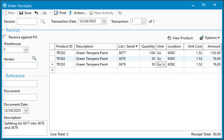 - Post when ready. This removes the original lot quantity and adds the new lot(s) to inventory.
